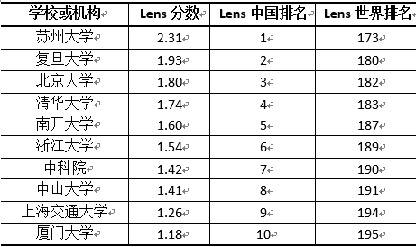 Lens分数主要反映了已发表的学术文章在专利申请中的引用情况。如果Lens分数较高,则意味着该科研机构或高校的研究有更高比例被专利文件引用;换句话说,这些研究成果更有可能启发了创新,呈现出良好的学术转化趋势。根据Lens分数,在最新的全球排名中,共有12所中国内地高校及科研机构进入世界前200名。其中,苏州大学的Lens分数达到2.31,排在中国内地首位。尽管从传统的三个Nature Index来看,苏州大学的学术论文发表数量少于北大、复旦等高校,但是在科研转化方面有更强的影响力(特别是在材料化学领域)。